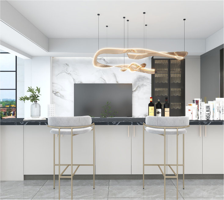 地點:湖南耒陽功能:偉業(yè)全案高定前臺 洽談區(qū) 客廳客廳用吧臺做過渡,配色以黑白灰為主,L型的布藝術(shù)沙發(fā)、巖紋的電視墻、一字型的地臺、條紋的地毯、異形的茶幾、輕奢...