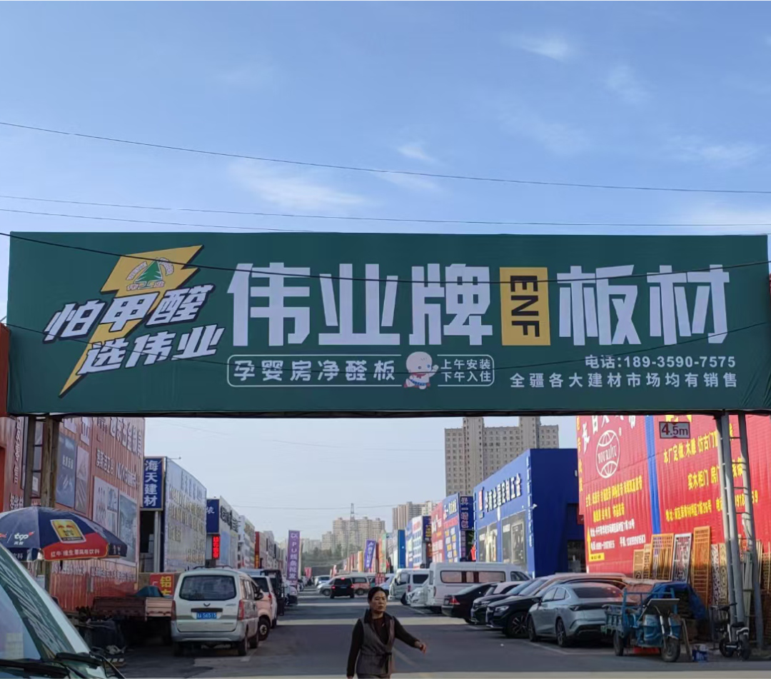 當烏魯木齊建材市場的晨光漫過街頭,偉業(yè)牌板材的戶外廣告悄然點亮——沒有繁復(fù)的設(shè)計,卻憑著“怕甲醛,選偉業(yè)”這句直白的話,成了人來人往中的溫暖焦點。 “怕甲醛,選...